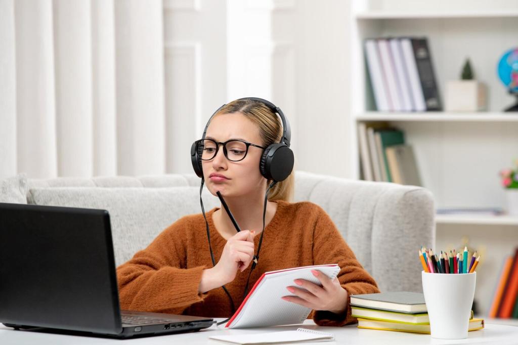 Nicht jeder kann live glänzen. Ergänzen Sie asynchrone Aufgaben mit klaren Deadlines, kurzen Erklärclips und Peer-Feedback. So bleibt Beteiligung möglich, auch bei schwankenden Verbindungen. Erzählen Sie, wie Sie asynchrones Arbeiten attraktiv gestalten!